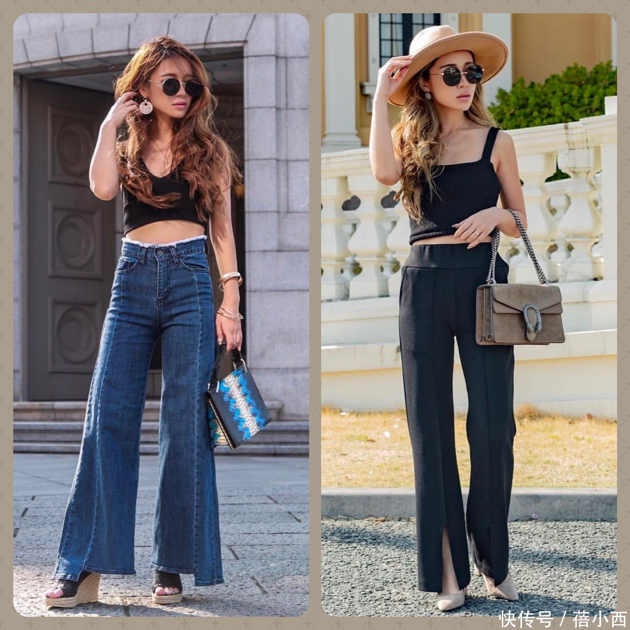 一件修身的短款背心或吊带最符合搭配高腰喇叭裤,中间娇傲一末节胃部肌肤,制造了显著的高腰位,太显高了!