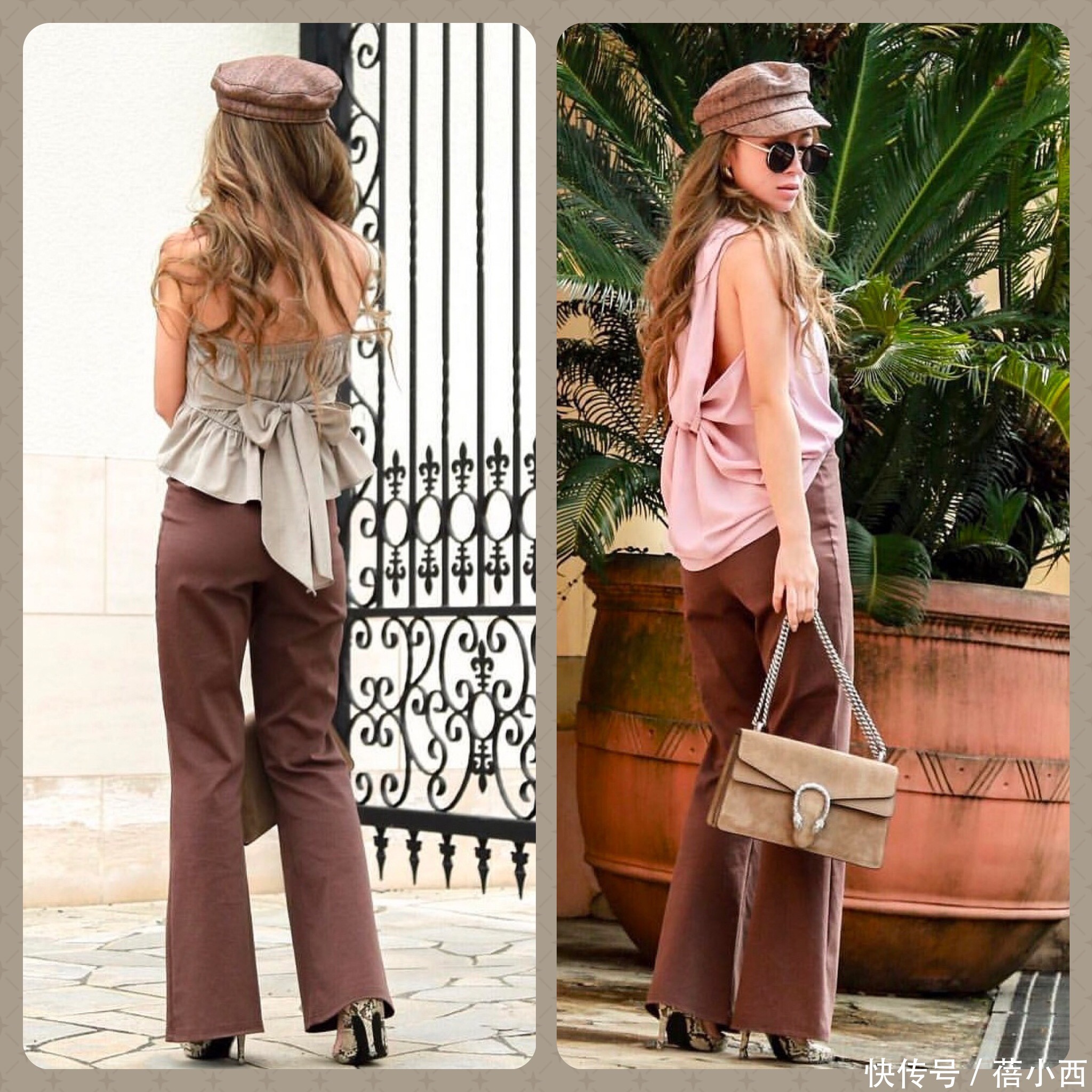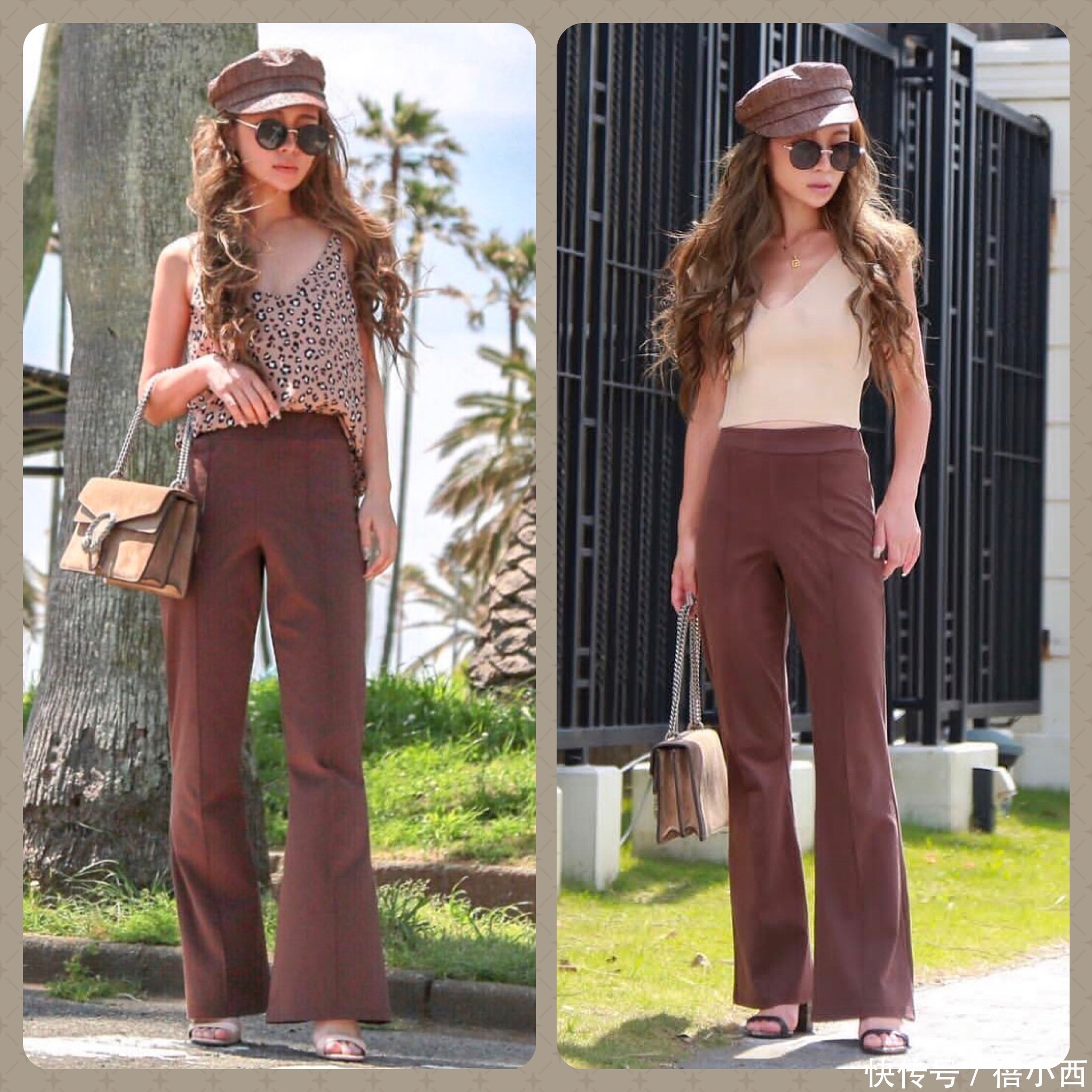 举例棕色喇叭裤就很有高档感,上半身搭配一件暖色系的背心偶然吊带衫就OK了,一定要穿高跟鞋哟~